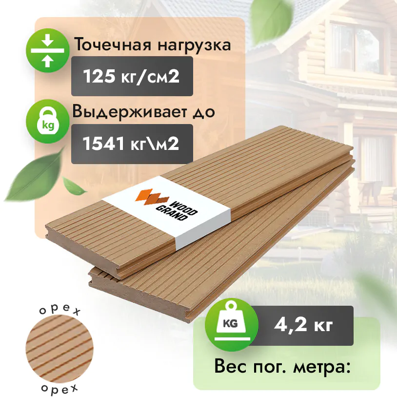 Наша террасная доска из ДПК выдерживает до 3318 кг/м2, влагостойкая, не требует ухода.