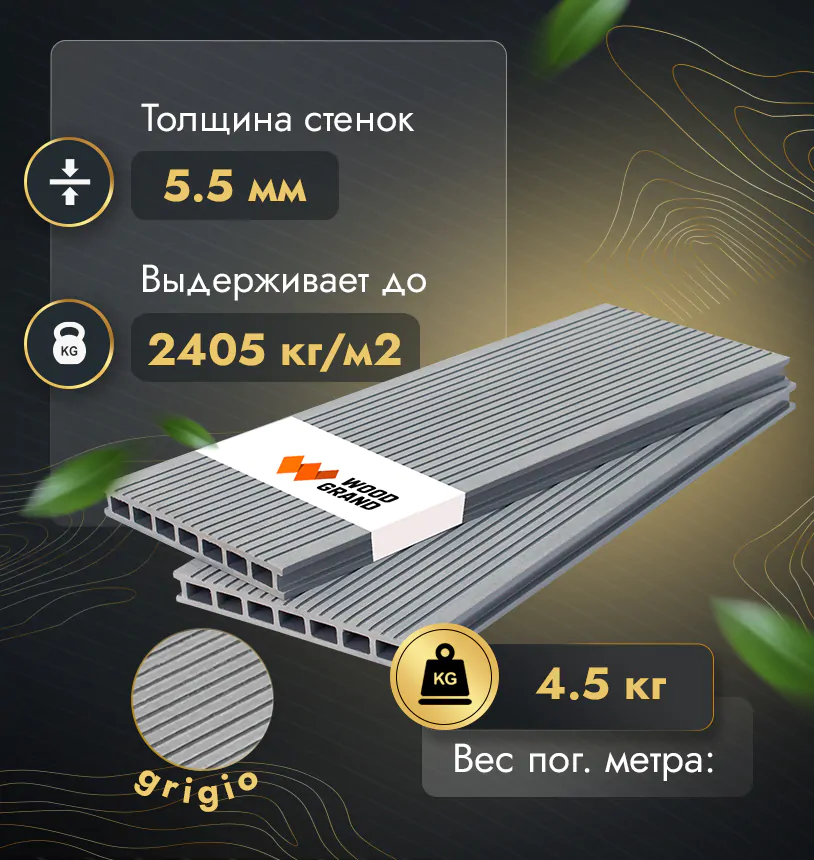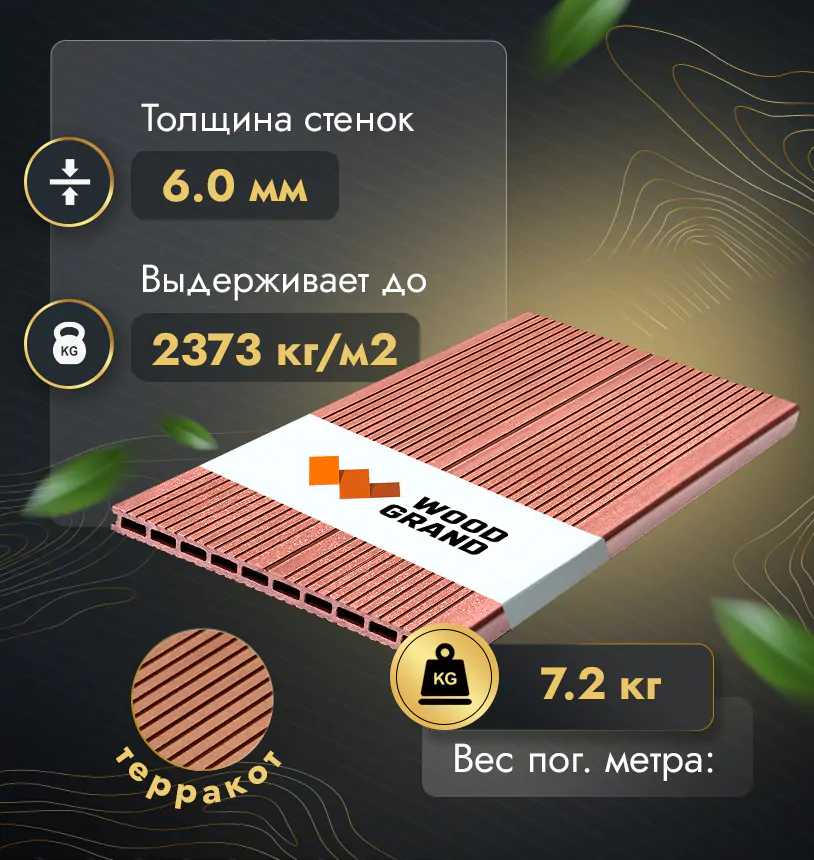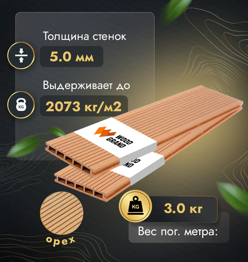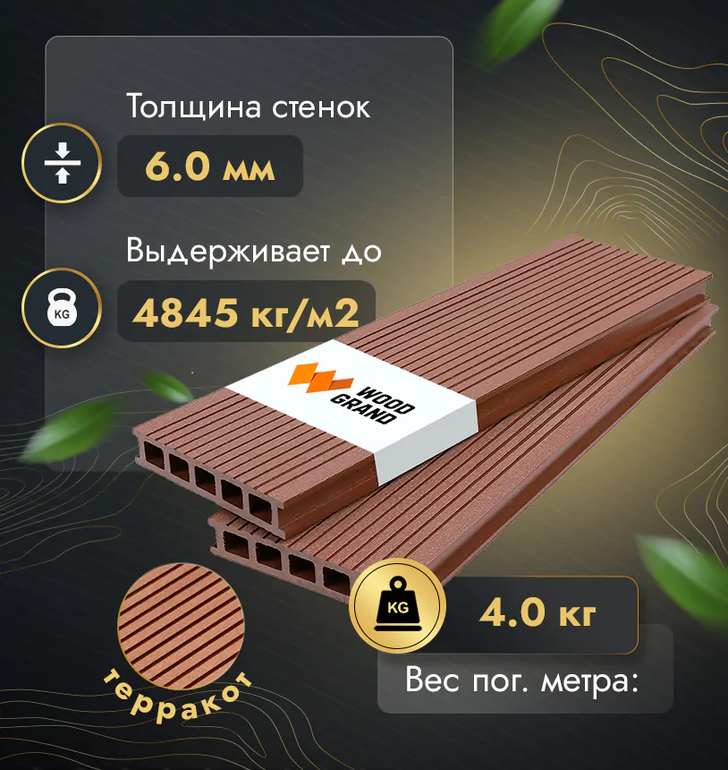 Наша террасная доска из МПК выдерживает до 3318 кг/м2, влагостойкая, не требует ухода.