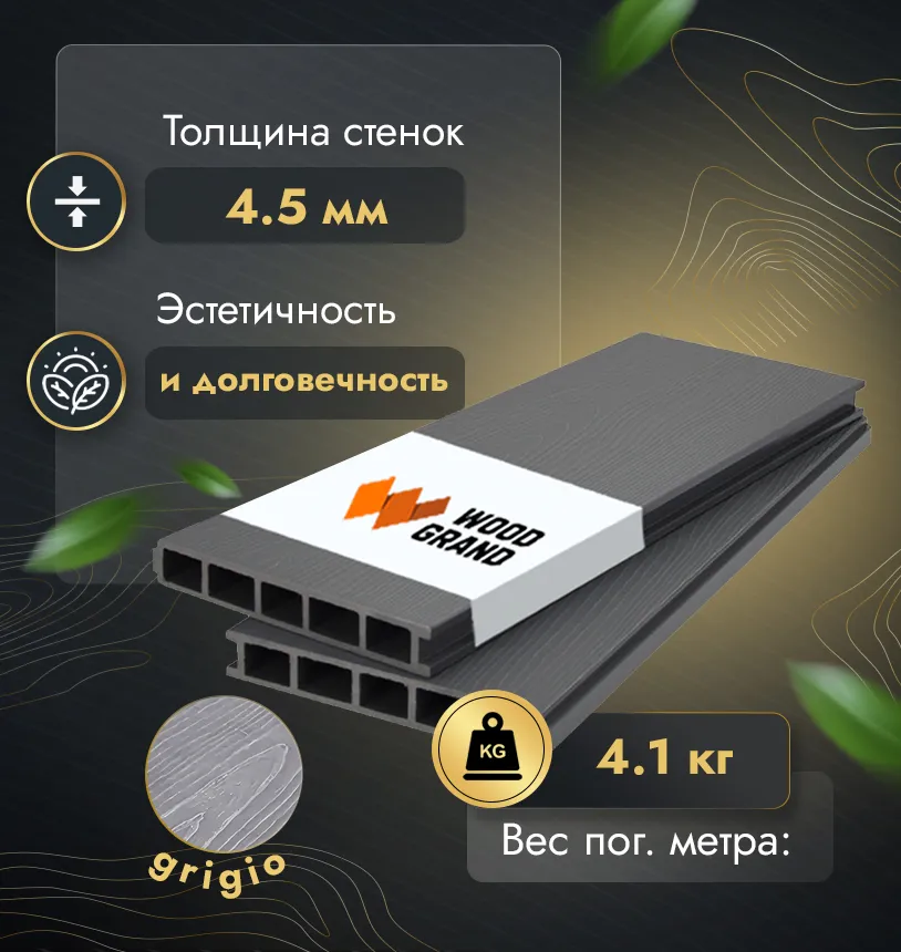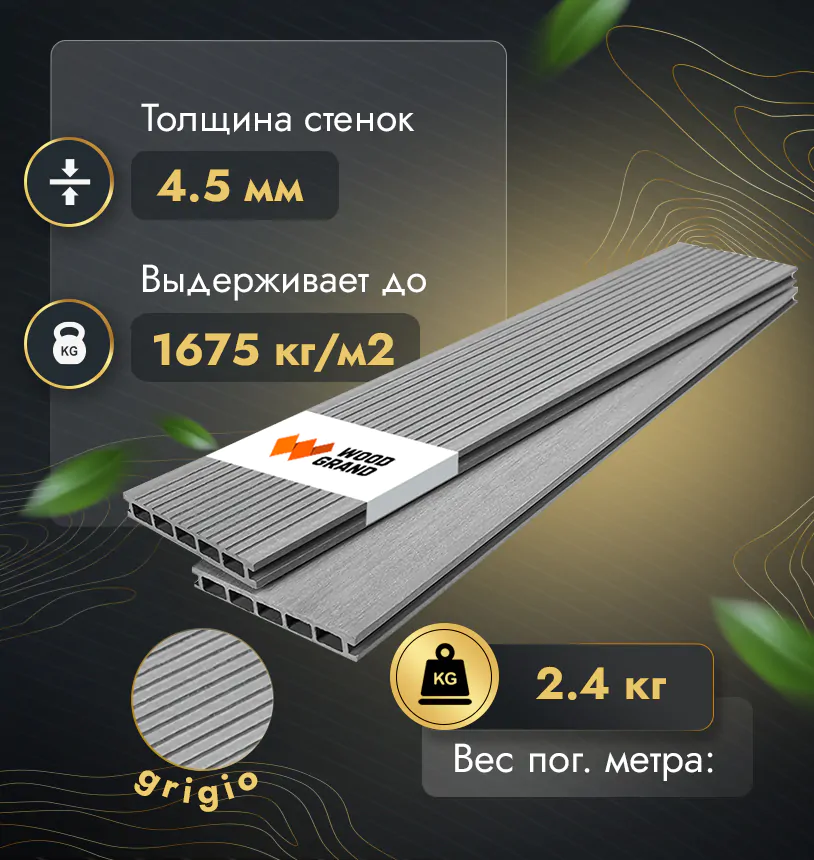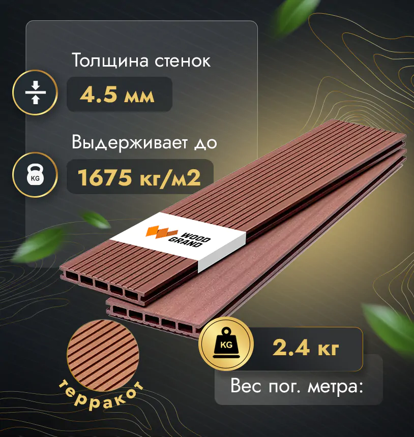Наша террасная доска из МПК выдерживает до 3318 кг/м2, влагостойкая, не требует ухода.